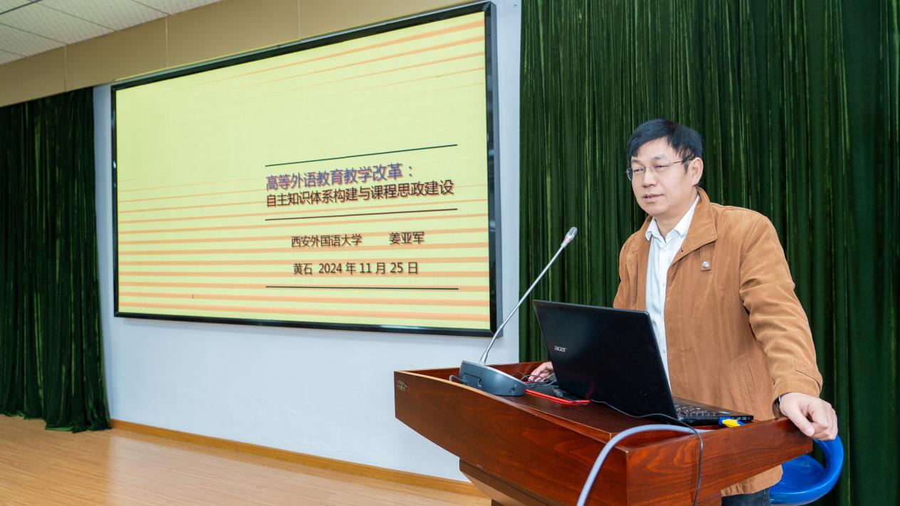 11月25日,受TYC234CC太阳成集团邀请,西安外国语大学原副校长、教育部高等学校外国语言文学类专业教学指导委员会委员、英语专业教学指导分委员会副主任委员姜亚军教授莅临我校,就外语学科建设与教育教学改革进行深度指导,并做了一场精彩的专题讲座。