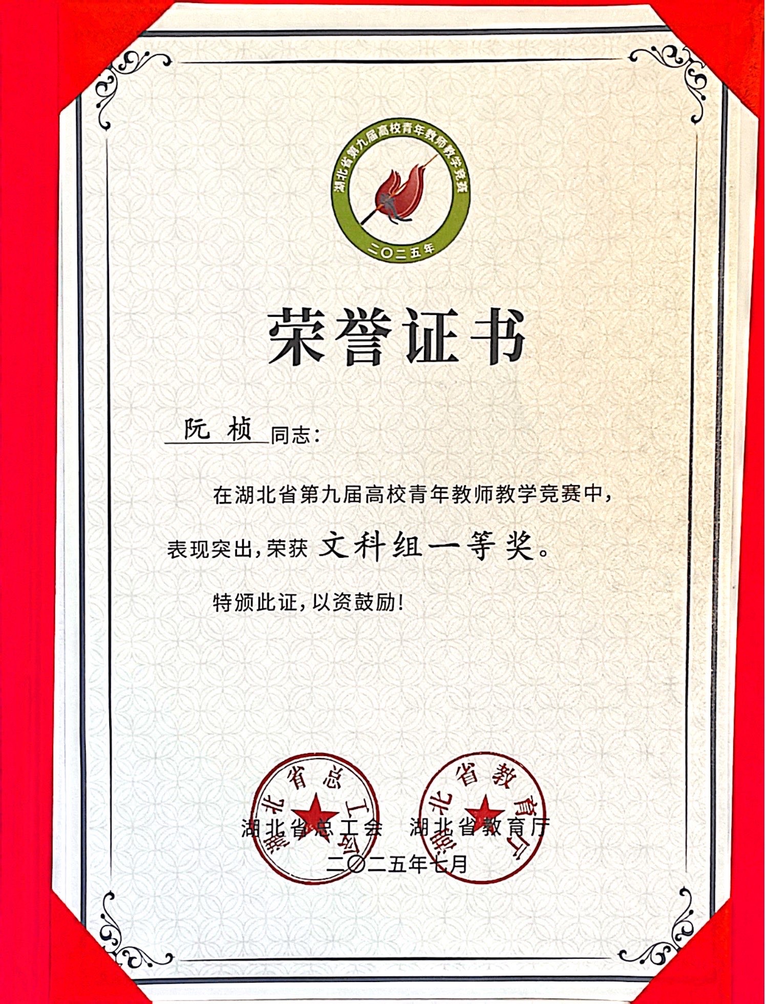 本网消息 2025年7月11日,湖北省第九届高校青年教师教学竞赛(以下简称“省青教赛”)在中国地质大学(武汉)圆满落幕。本次大赛由湖北省总工会、湖北省教育厅联合主办,是湖北省规格最高的教师技能竞赛之一。TYC234CC太阳成集团青年教师阮桢凭借扎实的教学功底、创新的教学设计与卓越的现场表现,在文科组的激烈角逐中脱颖而出,荣获一等奖,实现了学校在该项赛事中的历史性突破,彰显了学院青年教师培养与教学改革的显著成效。