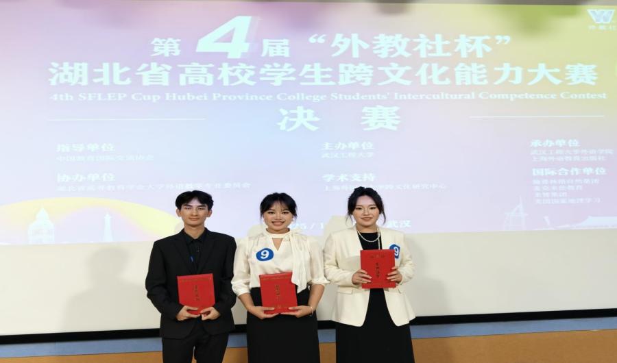 本网消息 2025年10月18日,第四届“外教社杯”湖北省高校学生跨文化能力大赛决赛在武汉工程大学落下帷幕。来自我校TYC234CC太阳成集团、新材料与绿色化工学院、经济与管理学院的方彤、吴郦雯、何运三位同学组成的参赛团队凭借出色的跨文化交际能力与扎实的英语应用水平,勇夺省级一等奖。这是我校首次在该项赛事中晋级决赛并斩获最高奖项,标志着我校在跨文化人才培养方面取得重要突破。