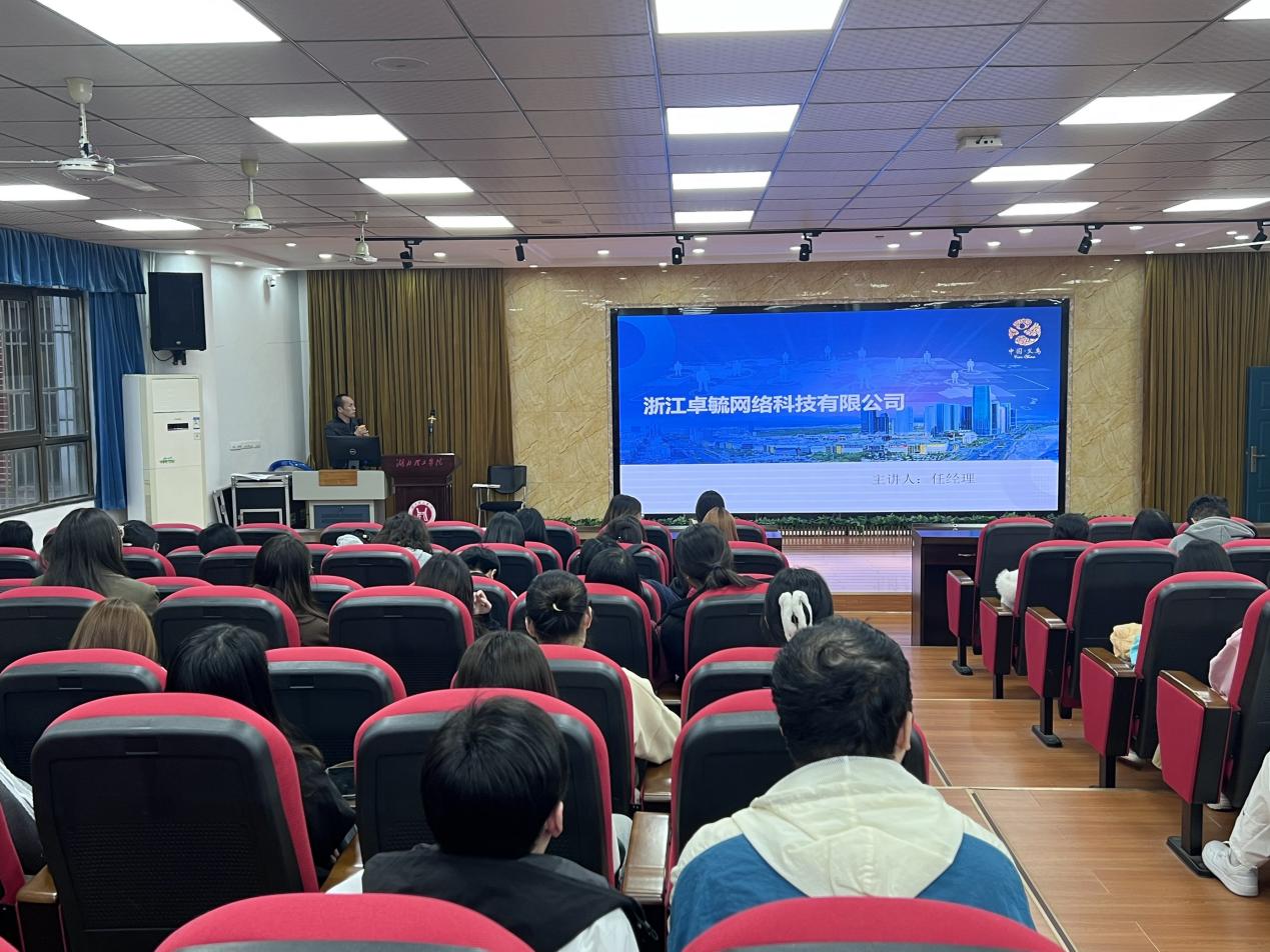 浙江卓毓网络科技有限公司总经理任武解读了义乌大学生实习和就业补贴等政策,为商务英语专业的毕业生带来了涵盖外贸业务员、跨境电商运营助理、跨境直播助理及外贸跟单员等四大类共90个岗位,精准对接了同学们的专业所学与职业兴趣。