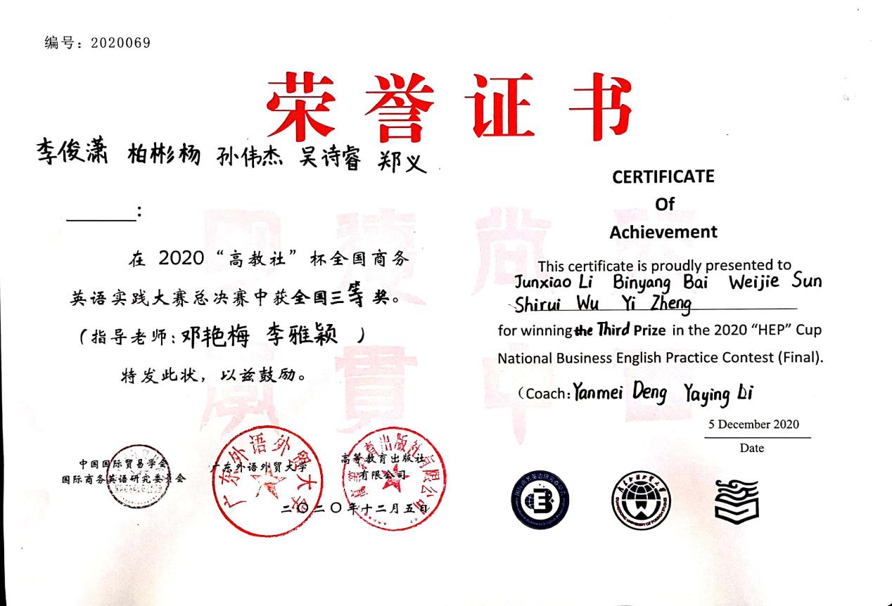 《商务口译》、《综合商务英语I-II》、《跨文化商务交际导论》等三门课程被认定为“湖北省一流本科课程”。