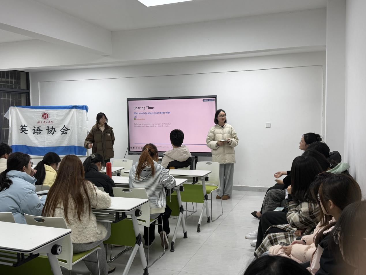 活动现场,两位主讲人率先分享了各自的旅行规划。一位同学满怀憧憬,诉说与家人共游江南水乡的心愿——盼望着在小桥流水间,细细领略古典园林的诗意与人间烟火的温暖。另一位同学则向往与好友结伴奔赴海滨城市,期待在沙滩上迎接第一缕晨光,体验冲浪的刺激与乐趣。她们用流利的英语描绘目的地的风土人情,分享旅途中的小目标,还不时与台下同学互动,邀请大家一同讲述自己的旅行故事。同学们积极响应,用英语诉说对不同城市、不同文化的向往,现场气氛热烈而融洽。